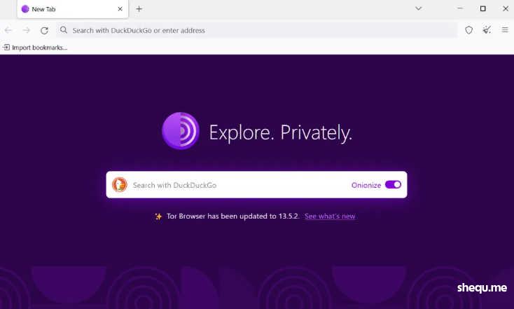 启动 Tor 浏览器后,您将进入紫色主页,屏幕中央有一个 DuckDuckGo 搜索引擎的搜索框。此搜索框允许您通过 DuckDuckGo 的 Tor 网站执行常规(但现在是匿名)的网页搜索。